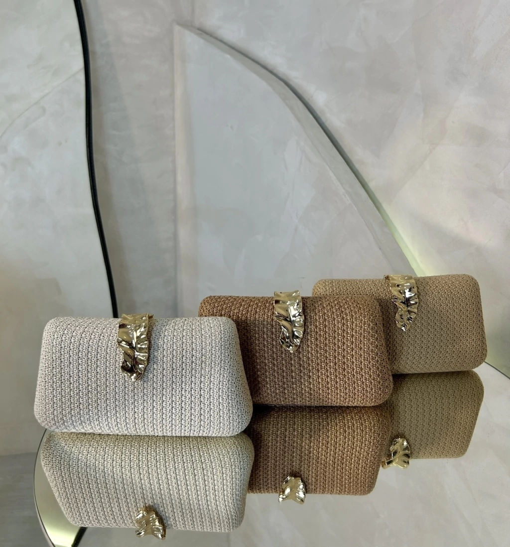 A clutch de palha natural é o toque final que transforma qualquer produção. Disponível em três tons sofisticados — areia, bege e caramelo —, ela é confeccionada em fibra trançada e possui fechamento com aplique de folha metálica dourada, um detalhe que adiciona luxo e originalidade.